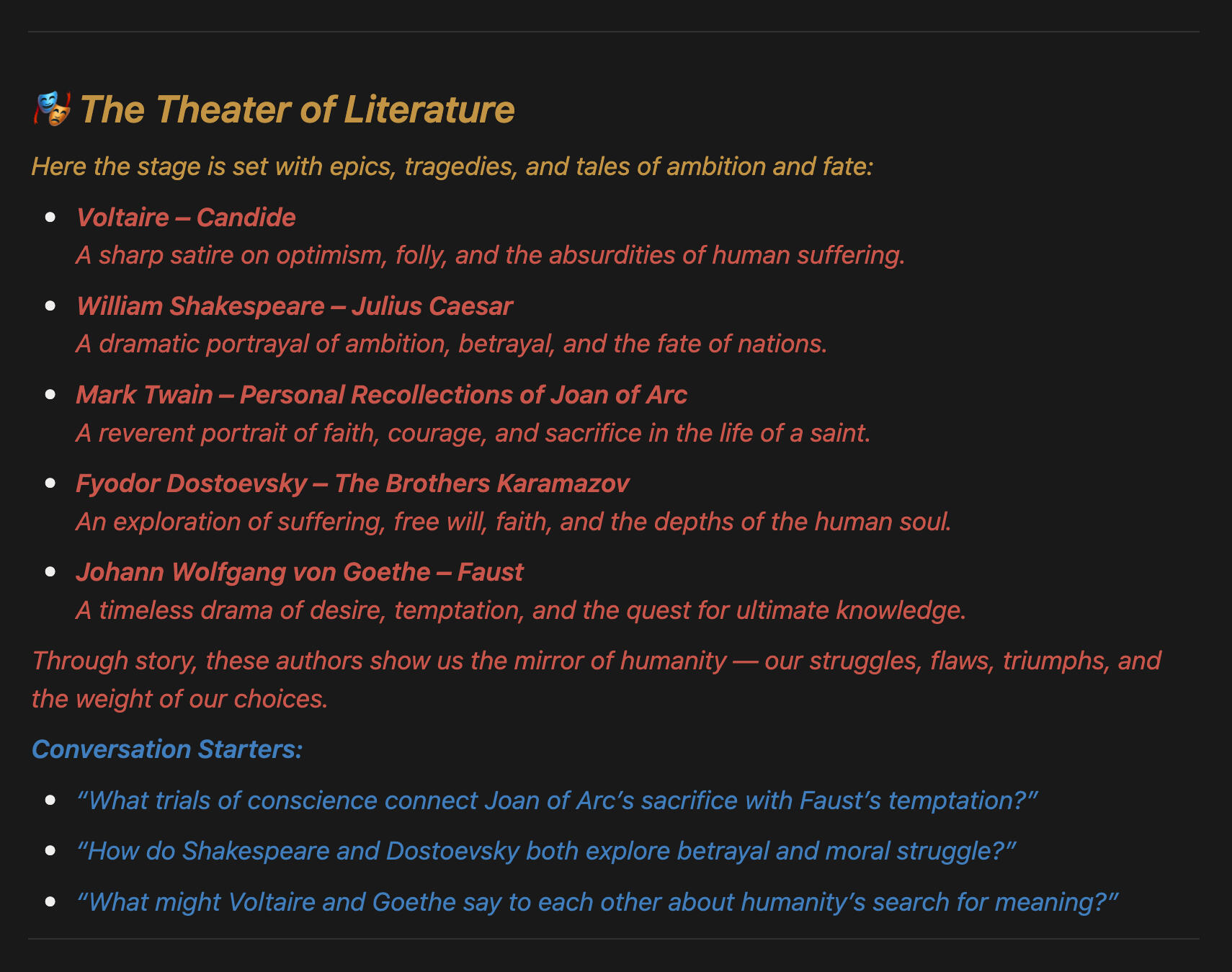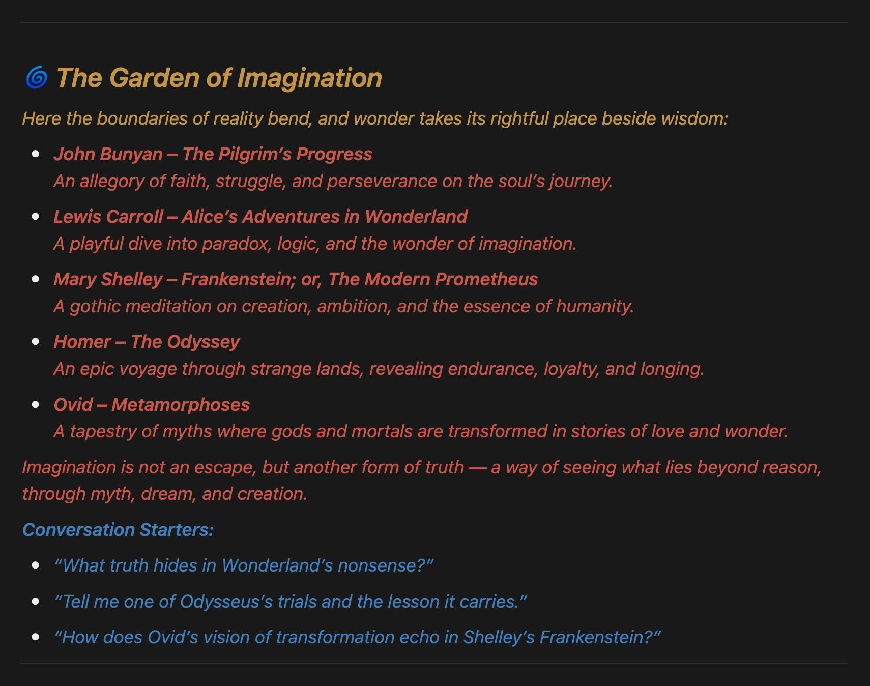 or follow the conversation starters.Every author is a guide, every work a lantern.